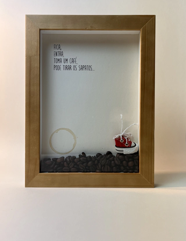 Material: MdF com moldura de vidro embutido de 3mm + Impressão em papel polén 220g+ pintura com café+ grão de café + mini all star artesanal.